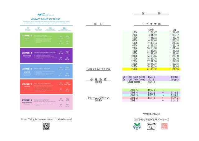 - 2026.03.22(日) 1000-1400 記録会&練習会@きらら 1500m,CSS(400m+200m)
