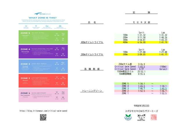 400mと200mの記録からCSS(クリティカルスイムスピード)とトレーニングゾーンを算出します。