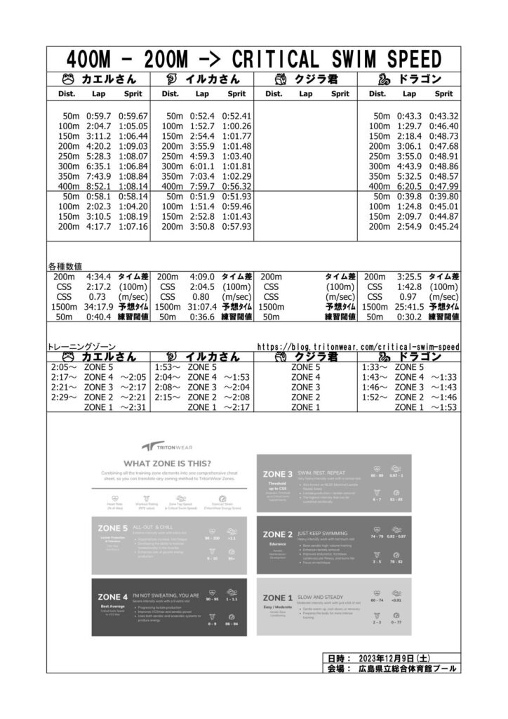 CSS計測:400m&200m計測、critical swim speed算出、トレーニングゾーン算出(4人)
