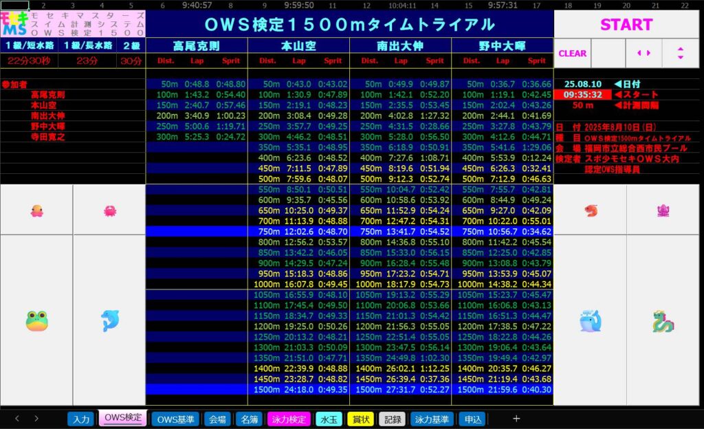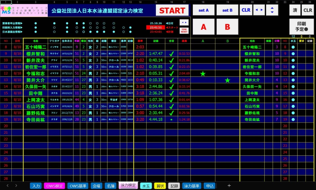 泳力検定用:各種目計測、判定、印刷、報告データ(100人まで?)