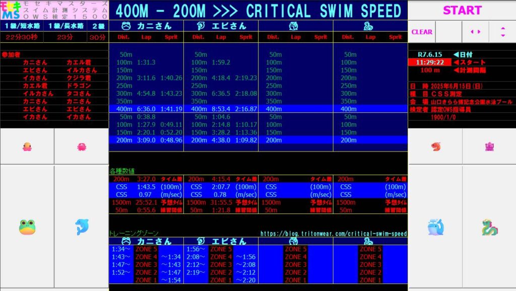 CSS計測:400m&200m計測、critical swim speed算出、トレーニングゾーン算出(4人)