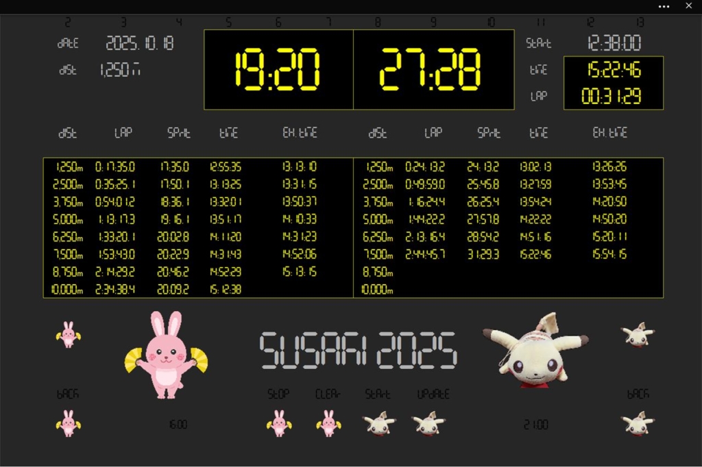 - すさきOWS10km用:1250m×8周回のラップ、次のラップ予想とアラーム付カウントダウン(2人)