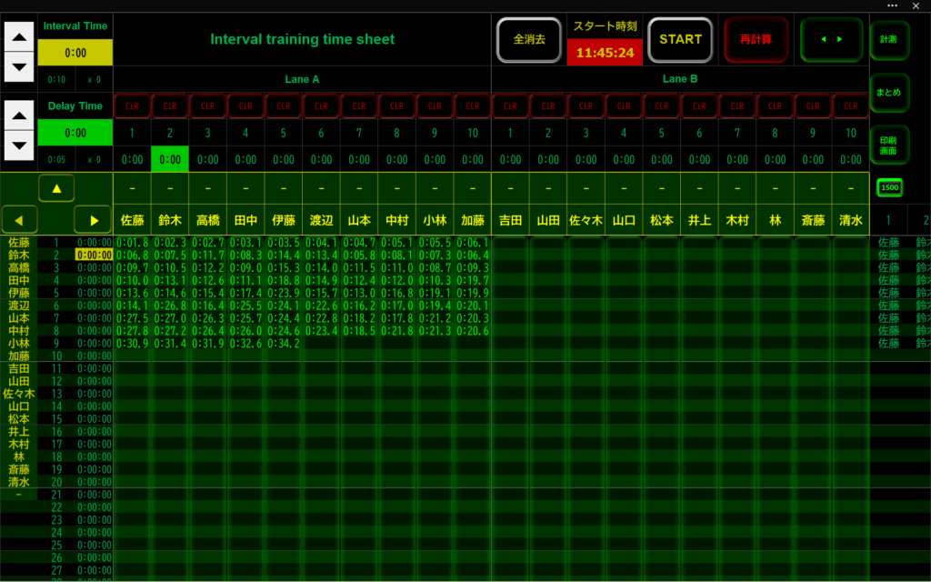 ・10人✕2レーンを想定。名前の移動により、選手の休憩、順番入替に対応