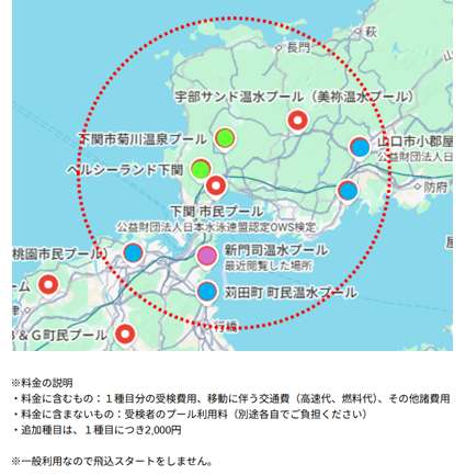 - 実施場所:地図円内のプール(桃園、苅田、山口、下関)