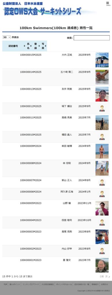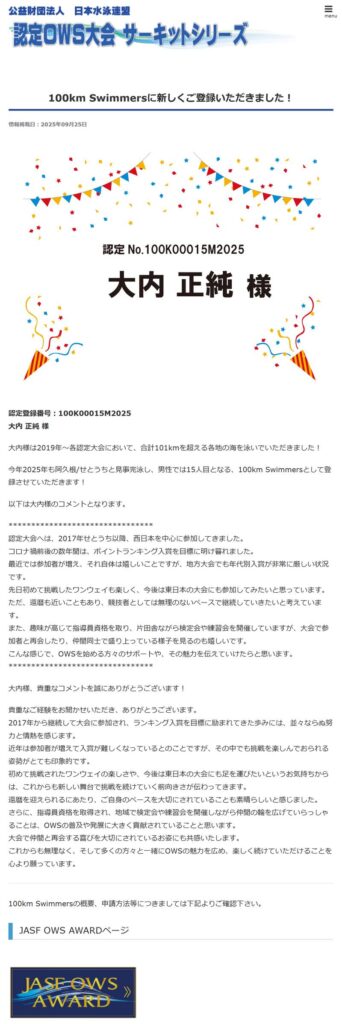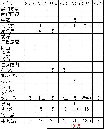 認定大会初参加の2017年せとうちから、2025年せとうちまで丸8年、男では15人目。(100㎞認定対象は2019年以降)参加したのは西日本の大会だけ、今後は他の東日本も出てみたい。年代別ポイントランキングは、2018年4位、コロナ禍のランキング中止(2020,2021)を挟み2019,2022,2023は2位、2024は14位。次は60歳からがんばる?